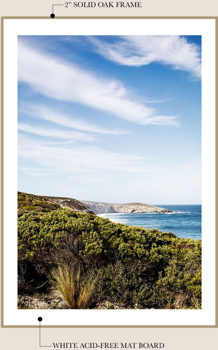 I work with a local professional framer to finish your fine art print in my signature framing style - unstained Tasmanian Oak and a traditional mat board*. The frame is finished with natural beeswax for a beautiful matte look and wood preservation.