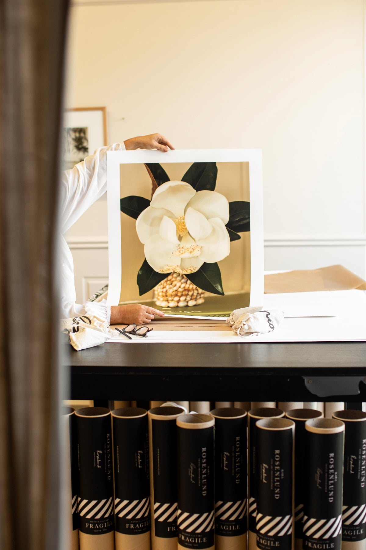 ‘Magnificent Magnolia’, featured in medium size with signature framing, in the home of Kara Rosenlund.