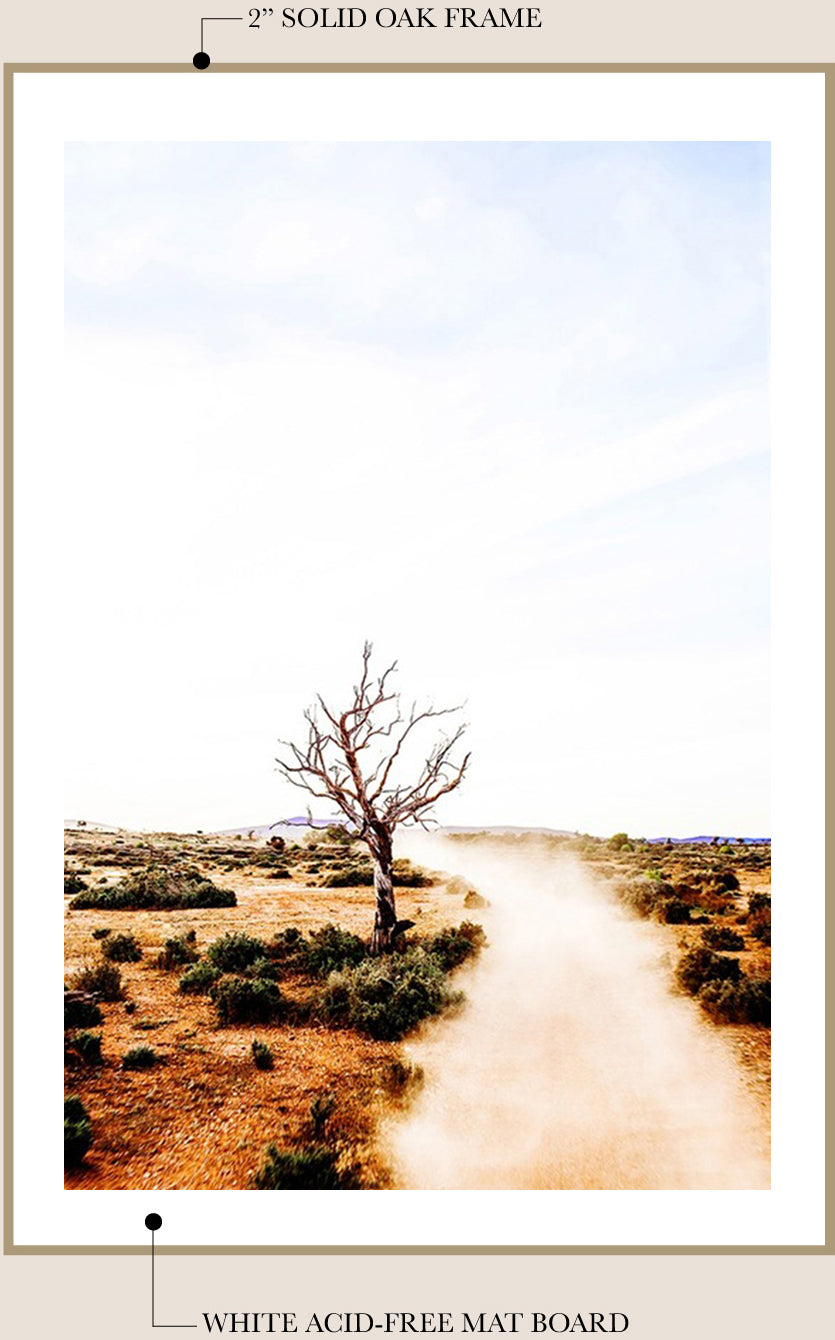 I work with a local professional framer to finish your fine art print in my signature framing style - unstained Tasmanian Oak and a traditional mat board*. The frame is finished with natural beeswax for a beautiful matte look and wood preservation.