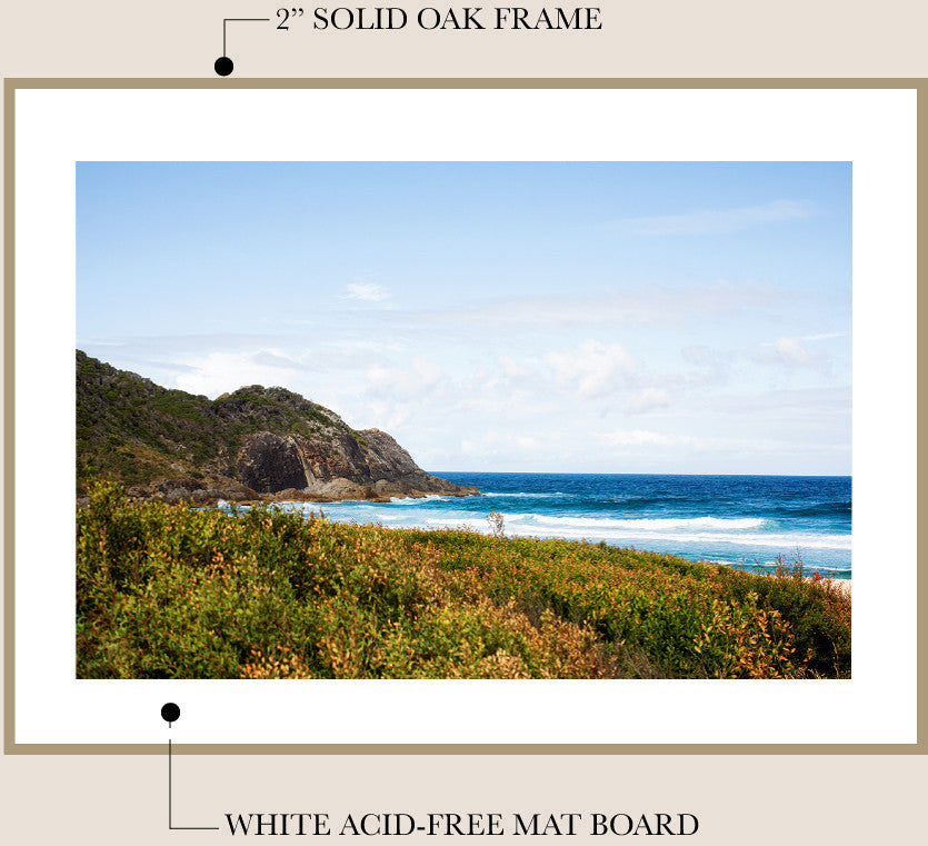 I work with a local professional framer to finish your fine art print in my signature framing style - unstained Tasmanian Oak and a traditional mat board*. The frame is finished with natural beeswax for a beautiful matte look and wood preservation.
