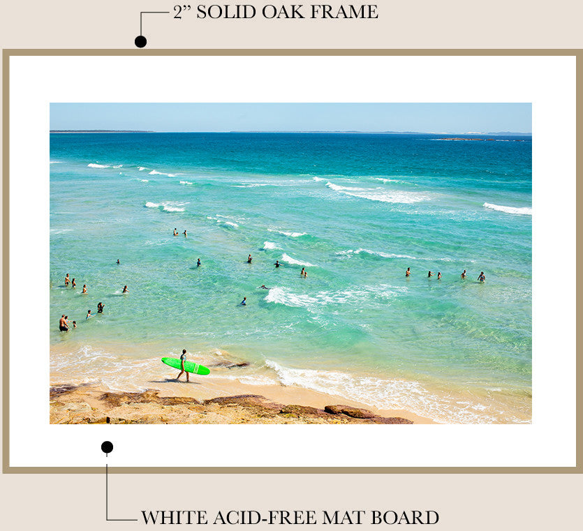 I work with a local professional framer to finish your fine art print in my signature framing style - unstained Tasmanian Oak and a traditional mat board*. The frame is finished with natural beeswax for a beautiful matte look and wood preservation.