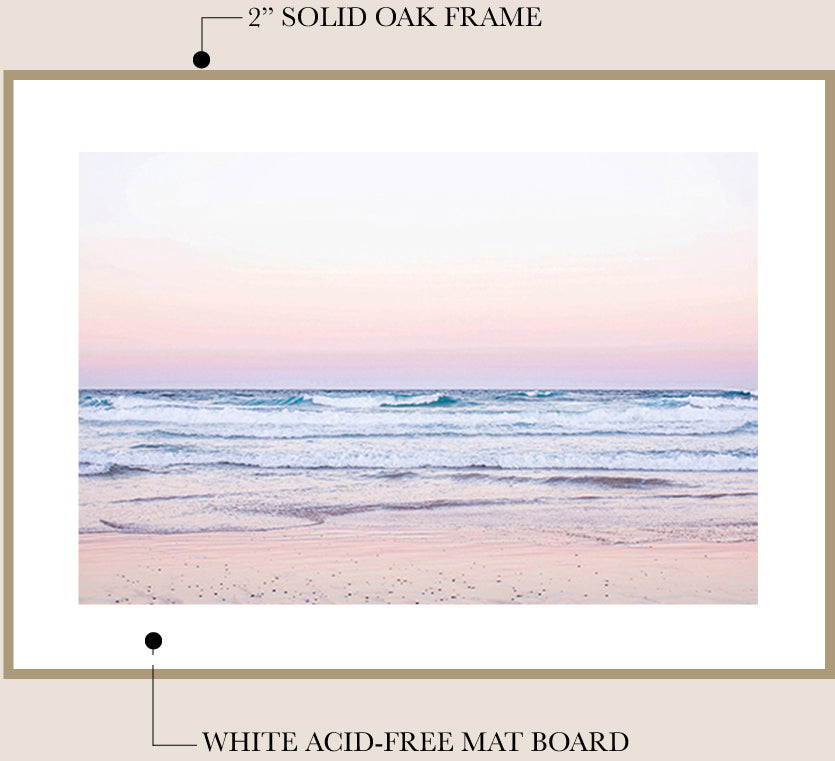 I work with a local professional framer to finish your fine art print in my signature framing style - unstained Tasmanian Oak and a traditional mat board*. The frame is finished with natural beeswax for a beautiful matte look and wood preservation.