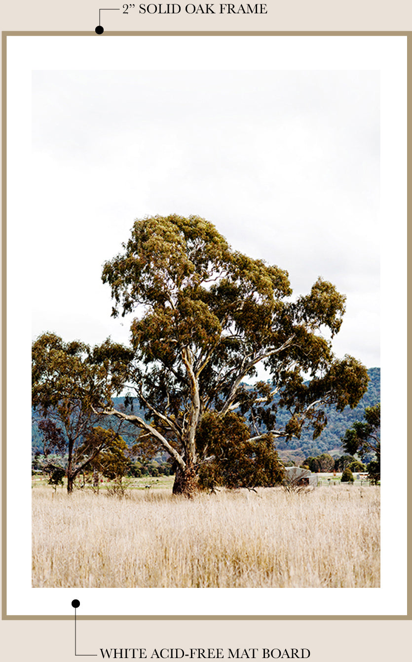I work with a local professional framer to finish your fine art print in my signature framing style - unstained Tasmanian Oak and a traditional mat board*. The frame is finished with natural beeswax for a beautiful matte look and wood preservation.