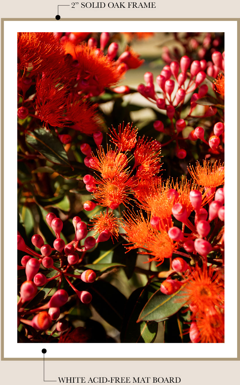 I work with a local professional framer to finish your fine art print in my signature framing style - unstained Tasmanian Oak and a traditional mat board*. The frame is finished with natural beeswax for a beautiful matte look and wood preservation.