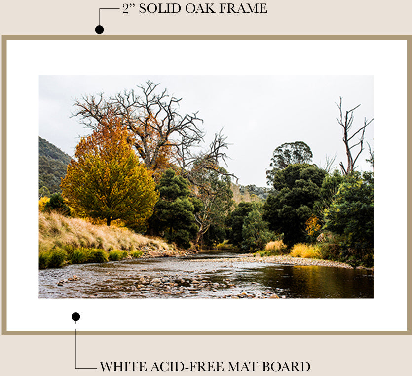 I work with a local professional framer to finish your fine art print in my signature framing style - unstained Tasmanian Oak and a traditional mat board*. The frame is finished with natural beeswax for a beautiful matte look and wood preservation.