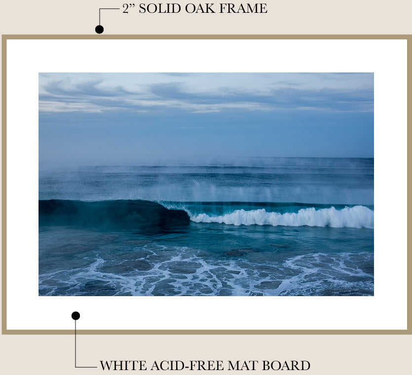 I work with a local professional framer to finish your fine art print in my signature framing style - unstained Tasmanian Oak and a traditional mat board*. The frame is finished with natural beeswax for a beautiful matte look and wood preservation.