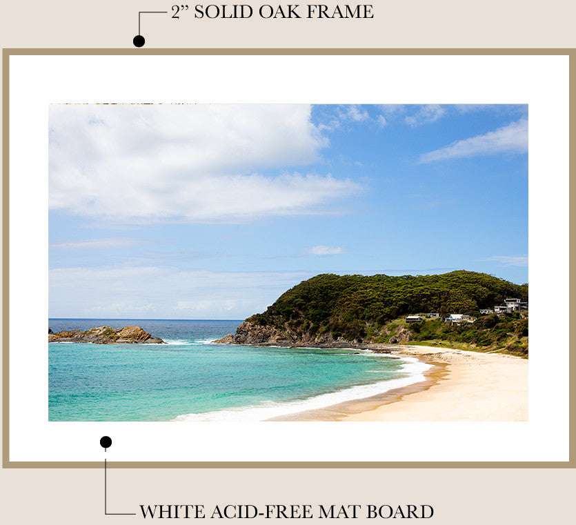 I work with a local professional framer to finish your fine art print in my signature framing style - unstained Tasmanian Oak and a traditional mat board*. The frame is finished with natural beeswax for a beautiful matte look and wood preservation.