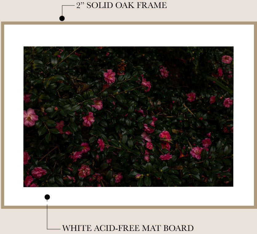 I work with a local professional framer to finish your fine art print in my signature framing style - unstained Tasmanian Oak and a traditional mat board*. The frame is finished with natural beeswax for a beautiful matte look and wood preservation.
