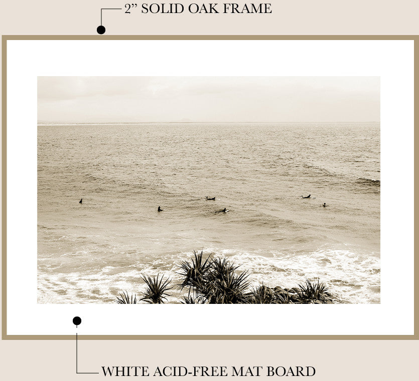 I work with a local professional framer to finish your fine art print in my signature framing style - unstained Tasmanian Oak and a traditional mat board*. The frame is finished with natural beeswax for a beautiful matte look and wood preservation.