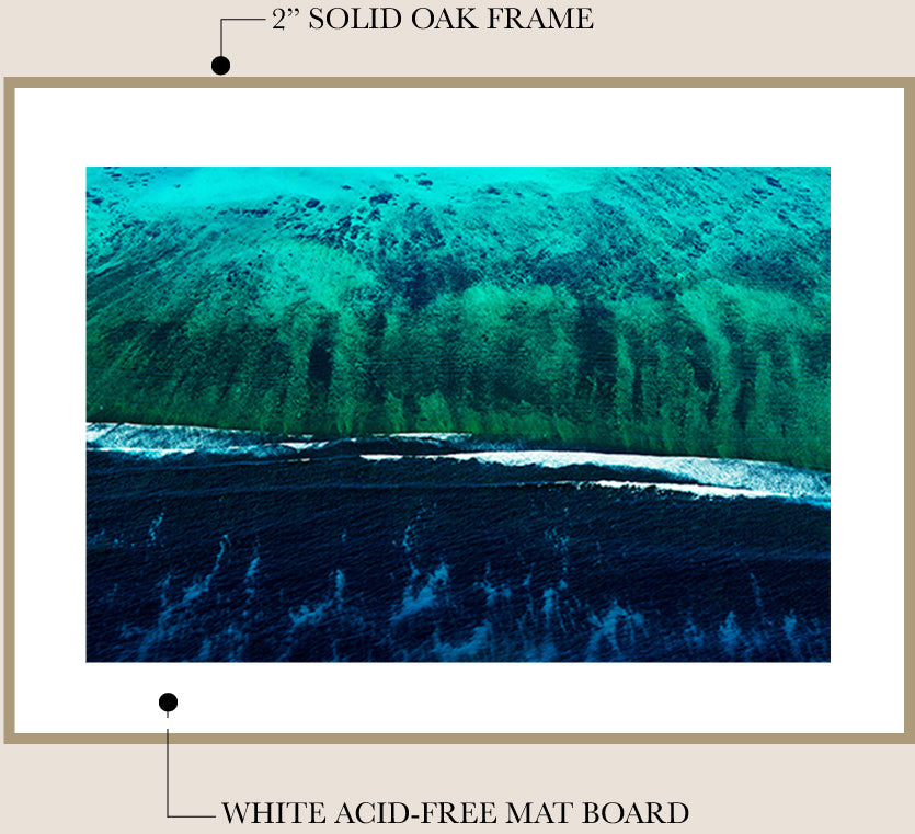 I work with a local professional framer to finish your fine art print in my signature framing style - unstained Tasmanian Oak and a traditional mat board*. The frame is finished with natural beeswax for a beautiful matte look and wood preservation.