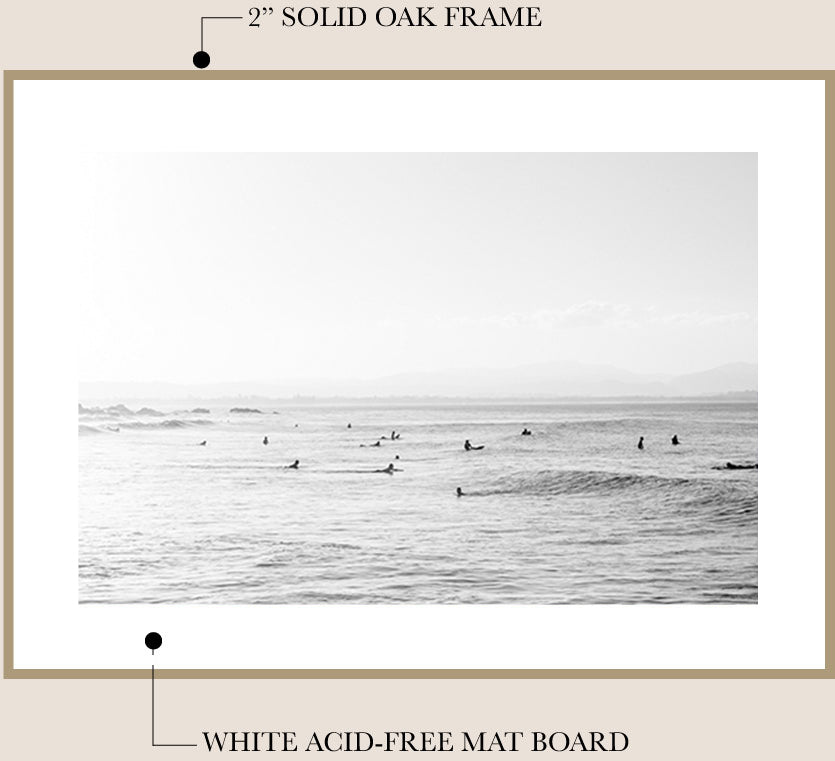 I work with a local professional framer to finish your fine art print in my signature framing style - unstained Tasmanian Oak and a traditional mat board*. The frame is finished with natural beeswax for a beautiful matte look and wood preservation.