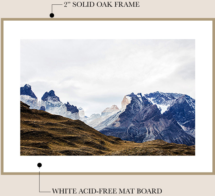 I work with a local professional framer to finish your fine art print in my signature framing style - unstained Tasmanian Oak and a traditional mat board*. The frame is finished with natural beeswax for a beautiful matte look and wood preservation.