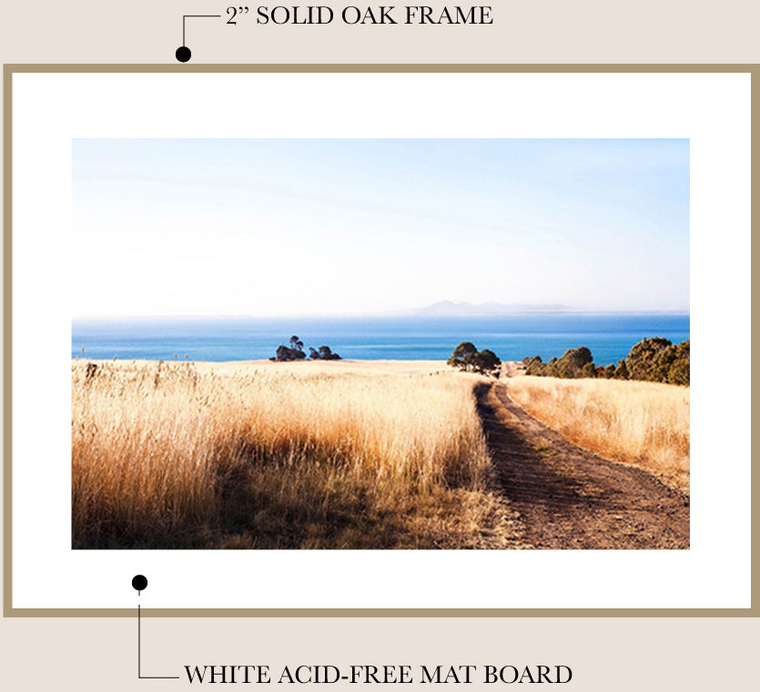 I work with a local professional framer to finish your fine art print in my signature framing style - unstained Tasmanian Oak and a traditional mat board*. The frame is finished with natural beeswax for a beautiful matte look and wood preservation.