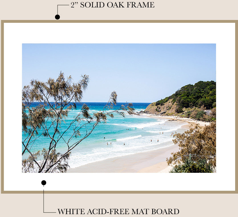 I work with a local professional framer to finish your fine art print in my signature framing style - unstained Tasmanian Oak and a traditional mat board*. The frame is finished with natural beeswax for a beautiful matte look and wood preservation.