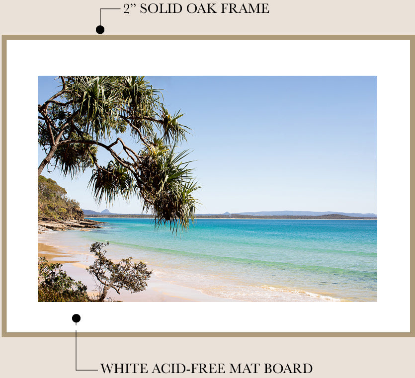 I work with a local professional framer to finish your fine art print in my signature framing style - unstained Tasmanian Oak and a traditional mat board*. The frame is finished with natural beeswax for a beautiful matte look and wood preservation.