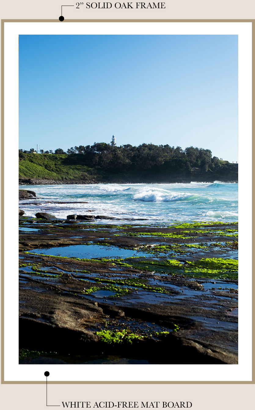 I work with a local professional framer to finish your fine art print in my signature framing style - unstained Tasmanian Oak and a traditional mat board*. The frame is finished with natural beeswax for a beautiful matte look and wood preservation.