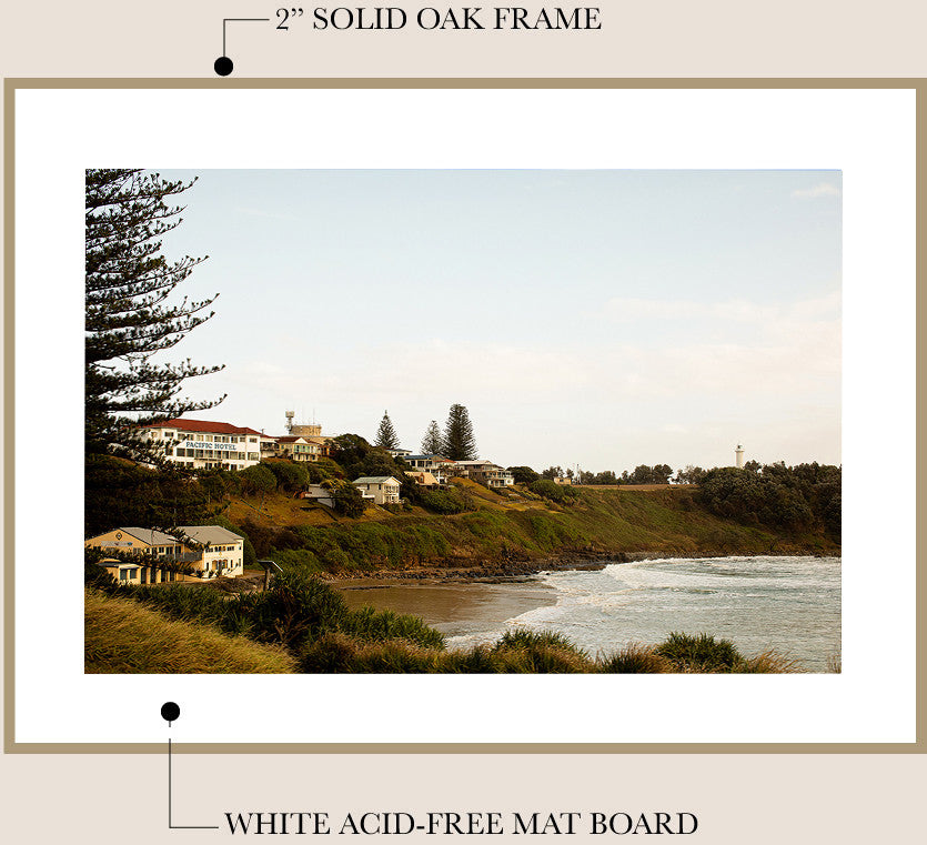 I work with a local professional framer to finish your fine art print in my signature framing style - unstained Tasmanian Oak and a traditional mat board*. The frame is finished with natural beeswax for a beautiful matte look and wood preservation.
